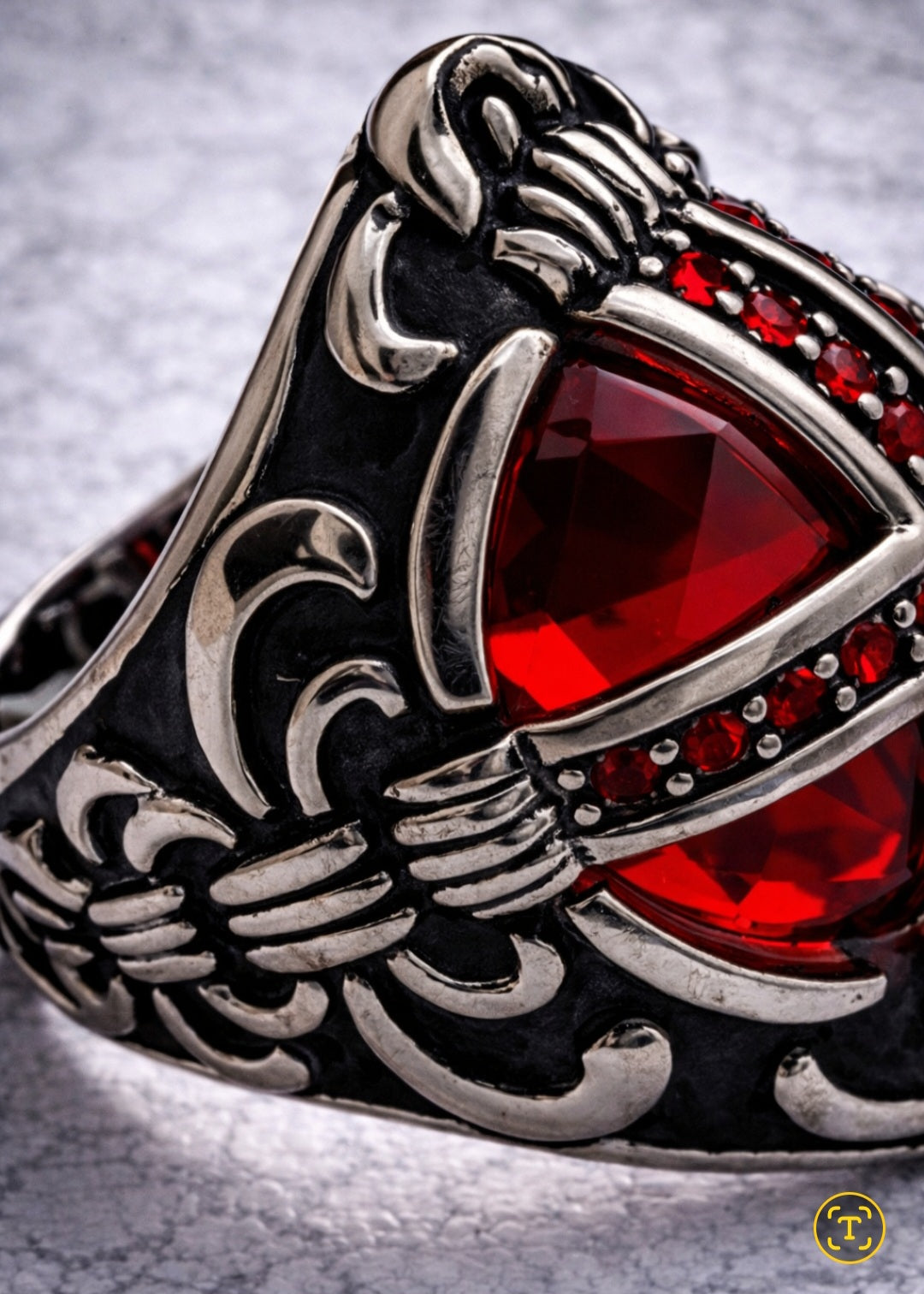 Anello Gothic in Argento S925 con Croce e Pietra Rossa – Dark Occult Ring