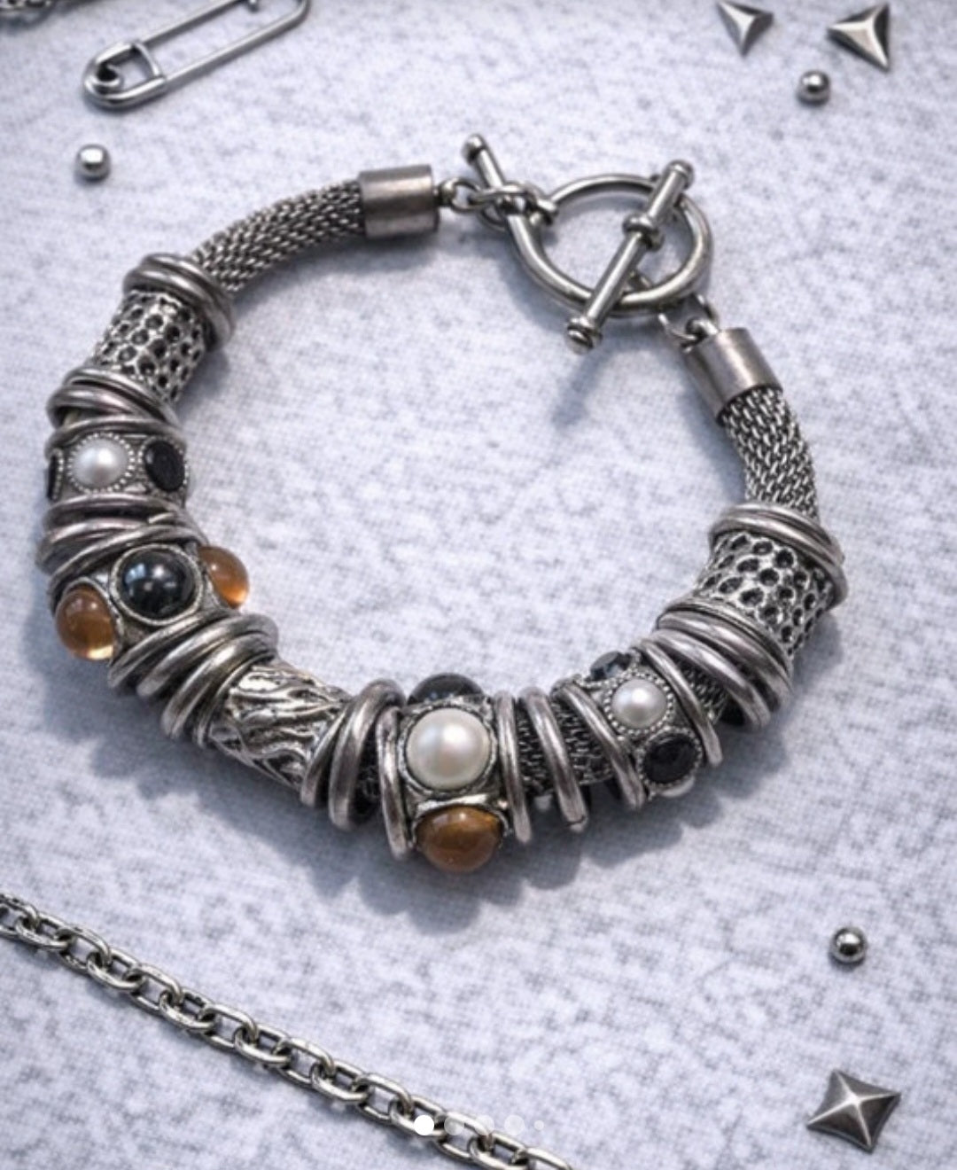 Bracciale Unisex Vintage Y2K con Perle e Pietre – Maglia Metallica Argento – USATO