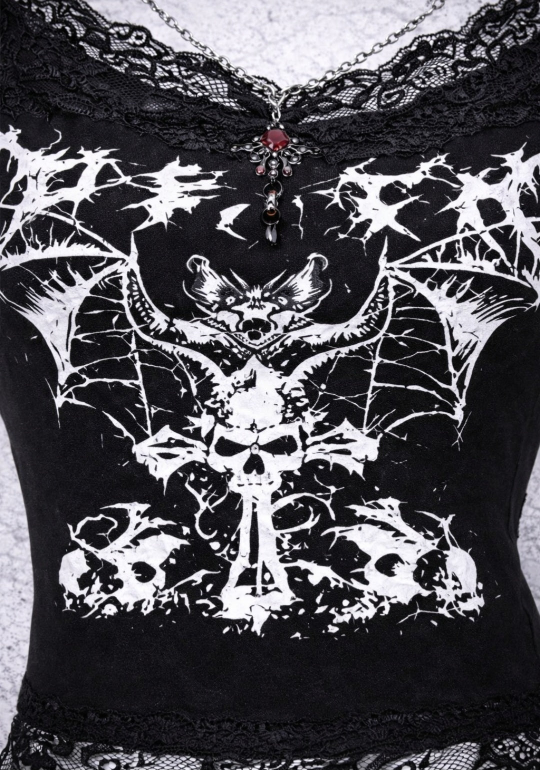 Top gothic nero con stampa pipistrello e bordo in pizzo